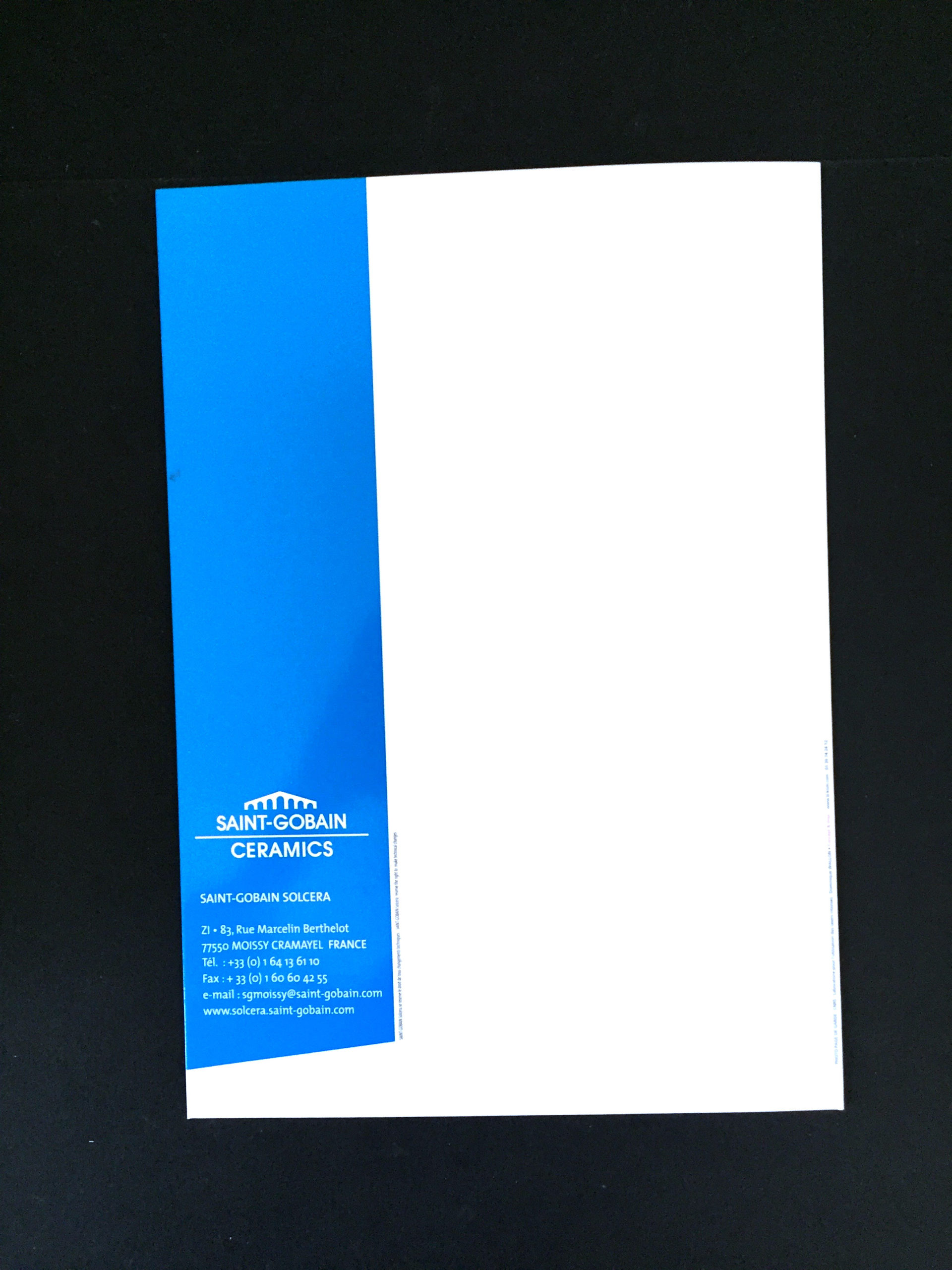 SAINT-GOBAIN Création et impression de divers plaquettes. (Pochette 3 volets + rabat pied central – Format fini 220*310) Previous: Mailing en petite quantité Next: Administratif